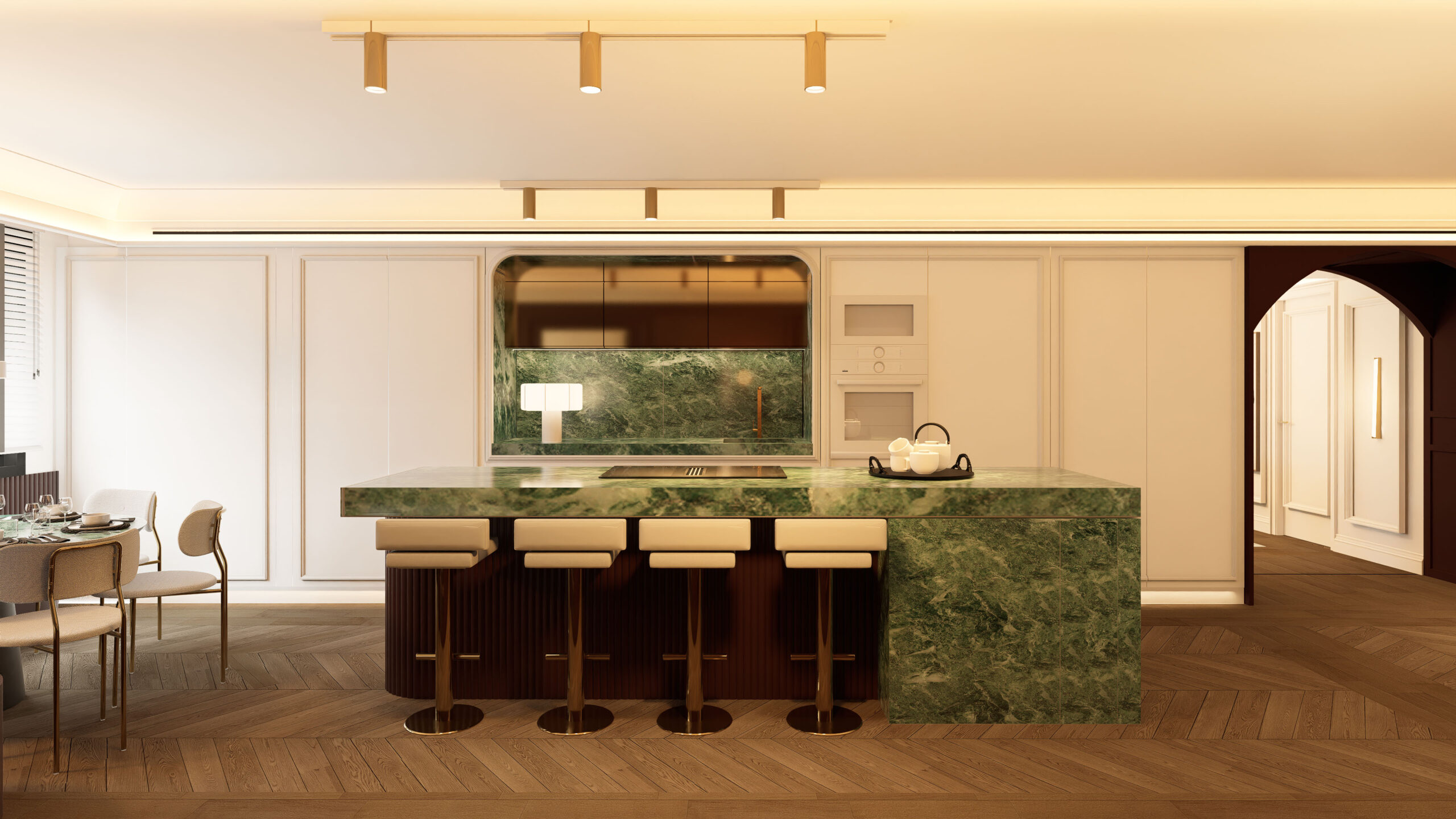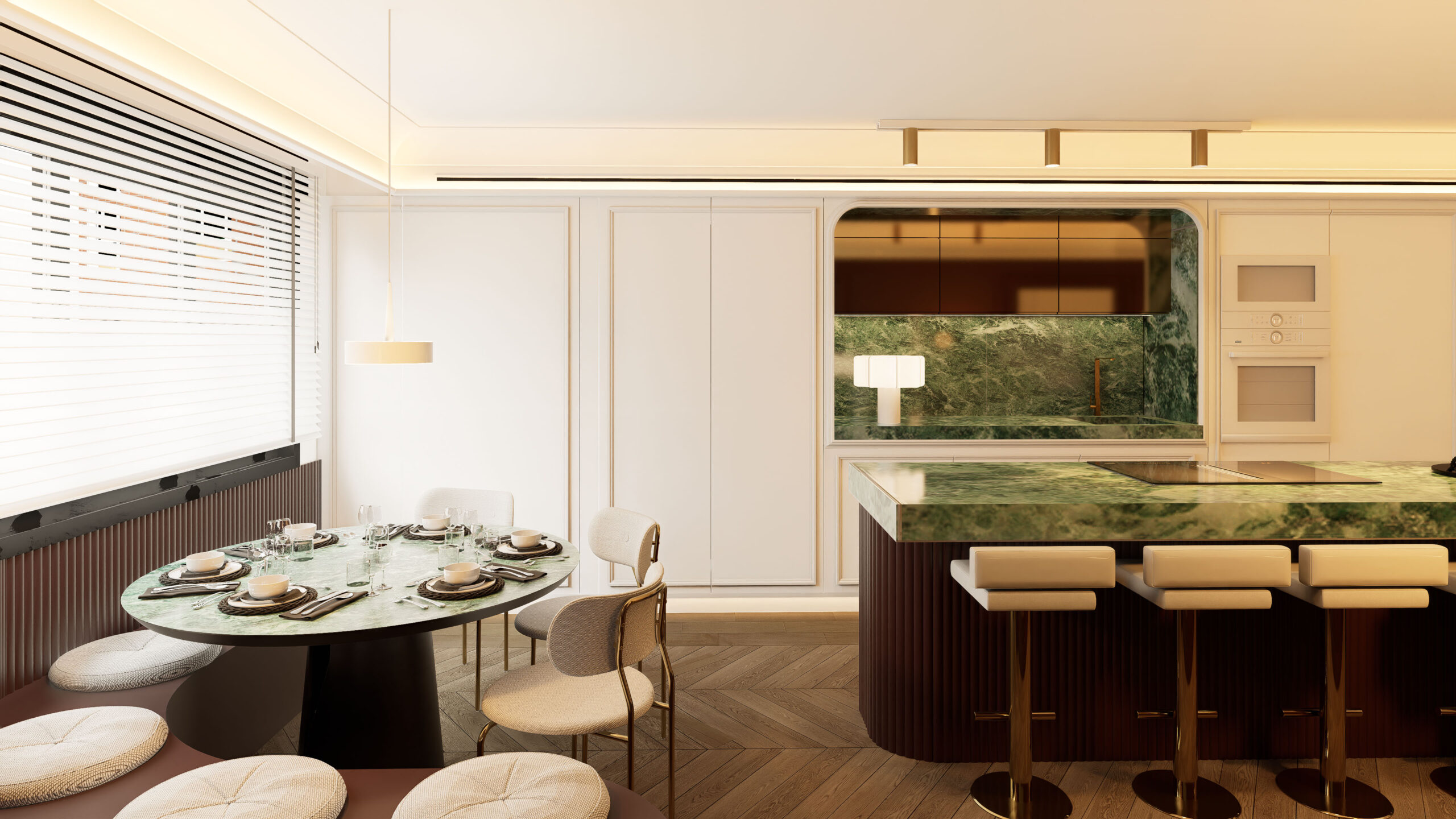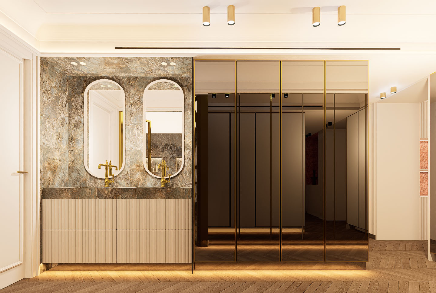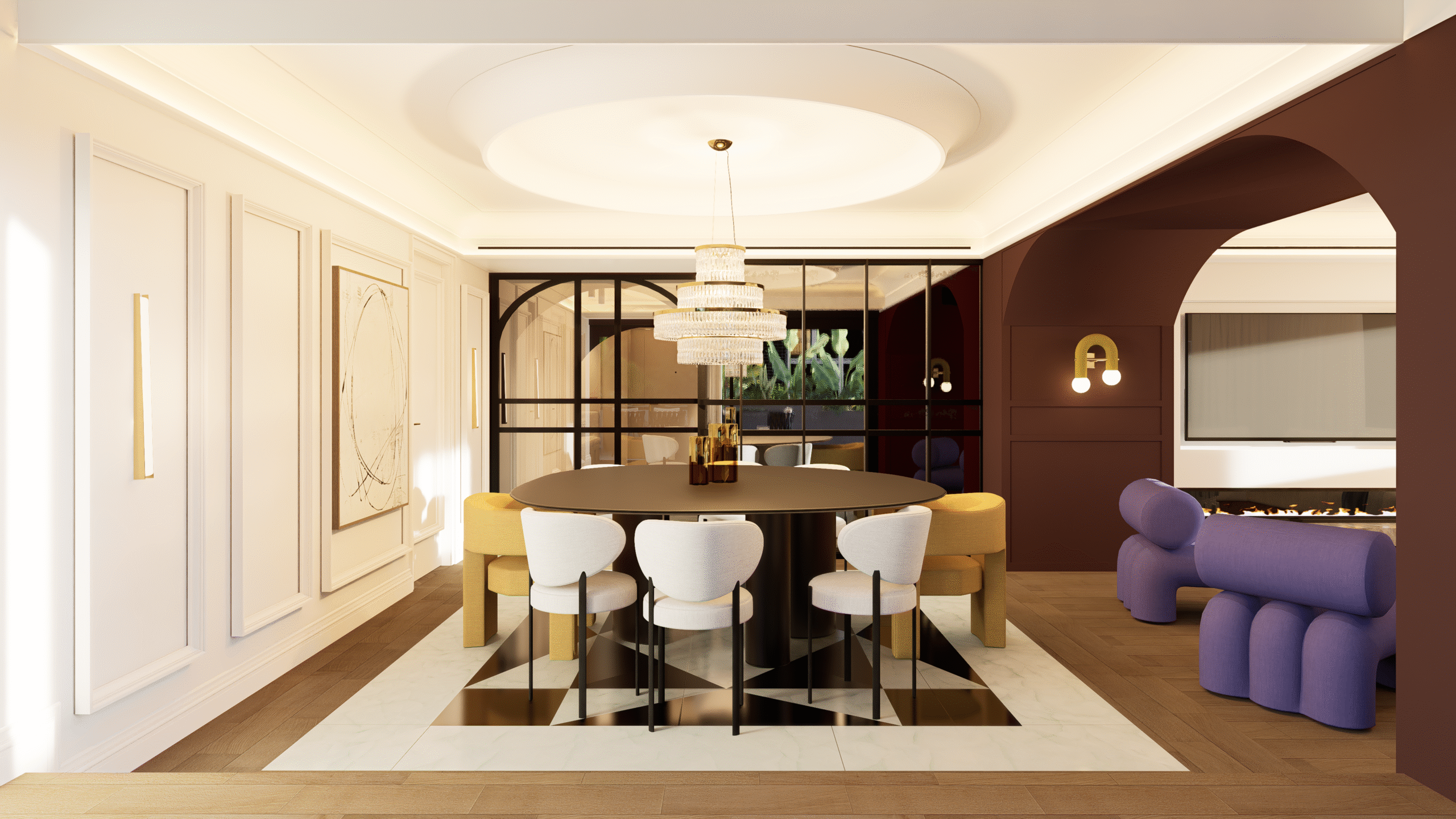 Los propietarios, con una personalidad arrolladora, han querido plasmar todo ese ingenio en su nuevo hogar, dotando cada estancia de elementos que la hacen única, irreverente, ICONO. Con una cocina donde se juega con los colores y las texturas, forrando de molduras y espejos toda la estancia dando una jerarquía al espacio y dotándolo de personalidad.