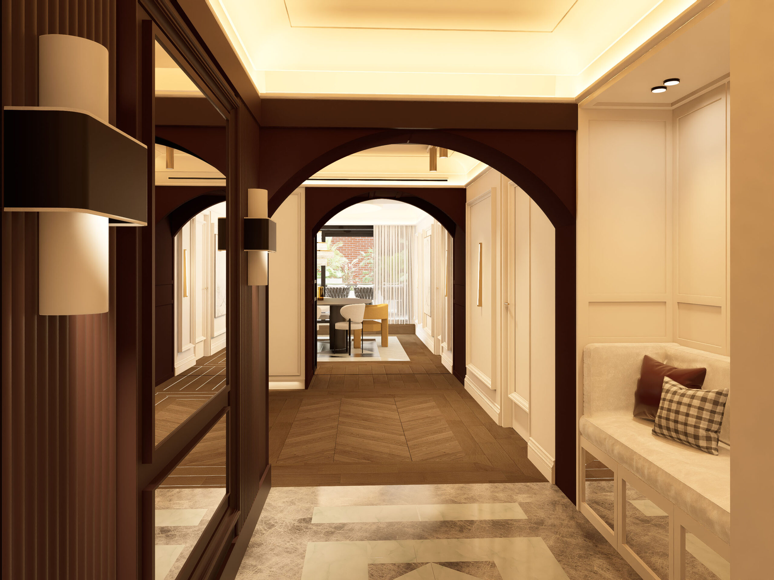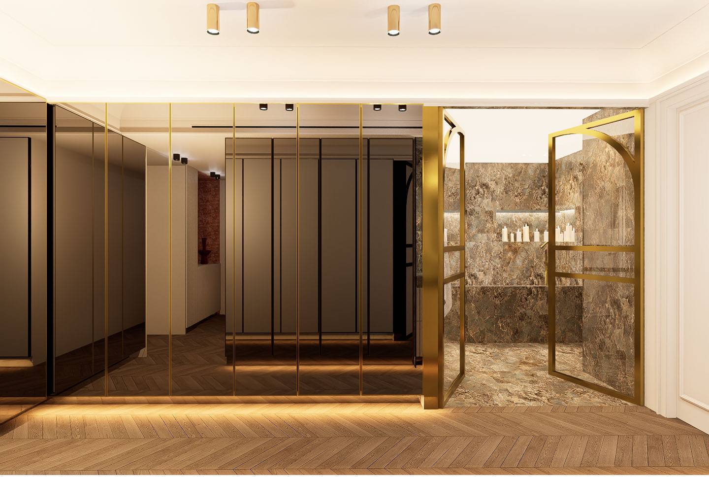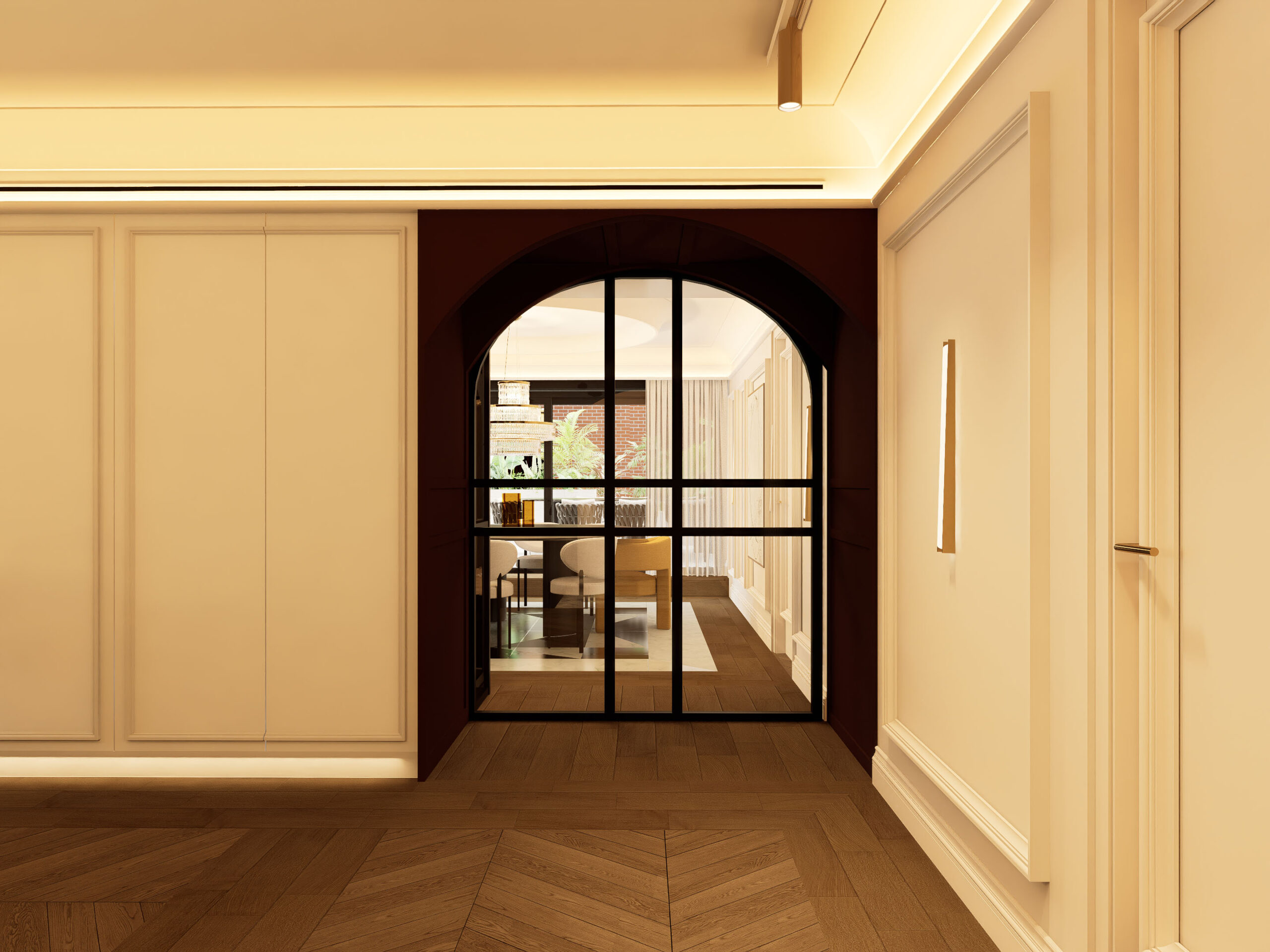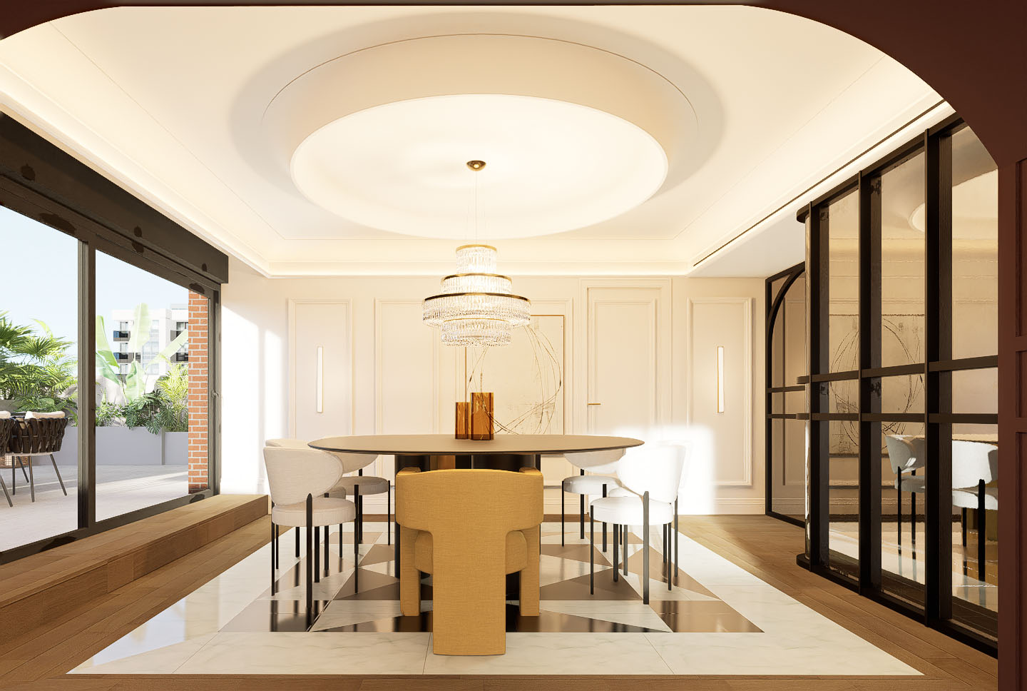 La altura de los techos era muy restrictiva al tratarse de un piso en un bloque plurifamiliar muy antiguo por lo que se ha hecho un estudio detallado de instalaciones e iluminación. Jugando con elementos decorativos como las molduras de pared, conseguimos dotar a todas las estancias de luz indirecta perimetral, bañando cada rincón de luz casi de manera teatral.